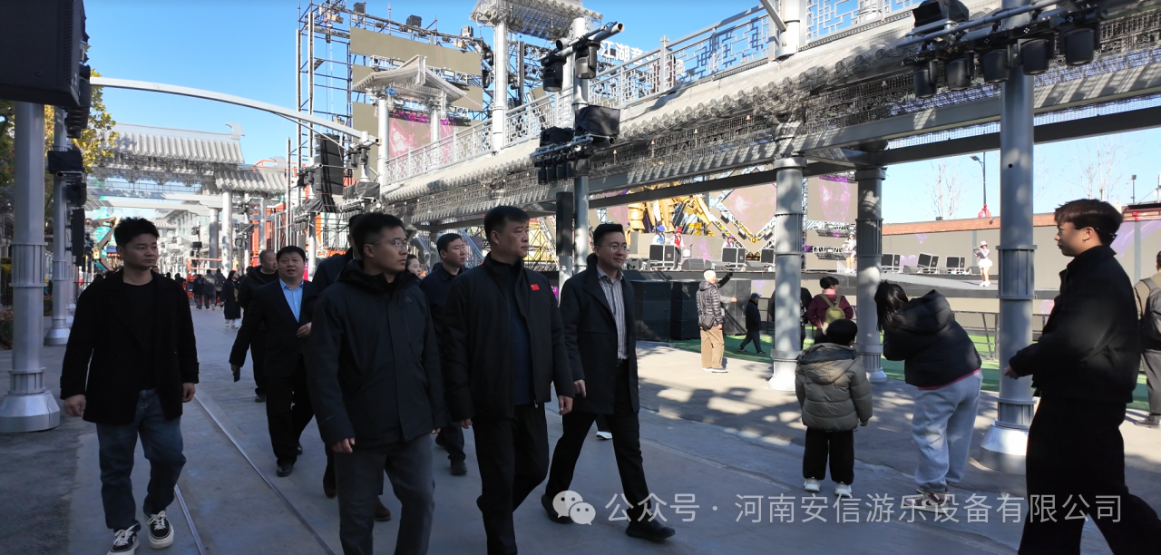 2025年 11 月 18 日下午,在获嘉县县长闫磊等领导的陪同下,肇东考察团首站来到集团江营工厂。集团董事长张景炜亲自为考察团详细介绍了安信文旅的全产业链布局:从江营工厂的游乐设备研发制造核心能力,到乐园运营、IP 创意的生态延伸,全方位展现了集团在游乐行业的综合竞争力。